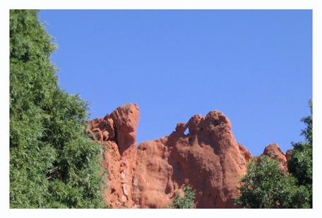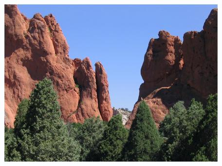 | "Siamese Twins" These are the Siamese Twins. The big bald mountain in the background on the right of the pictures is Pike's Peak. |