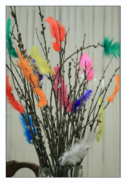 To continue a tradition we've had since our first year of marriage, Laura tied feathers on the pussy willows yesterday.