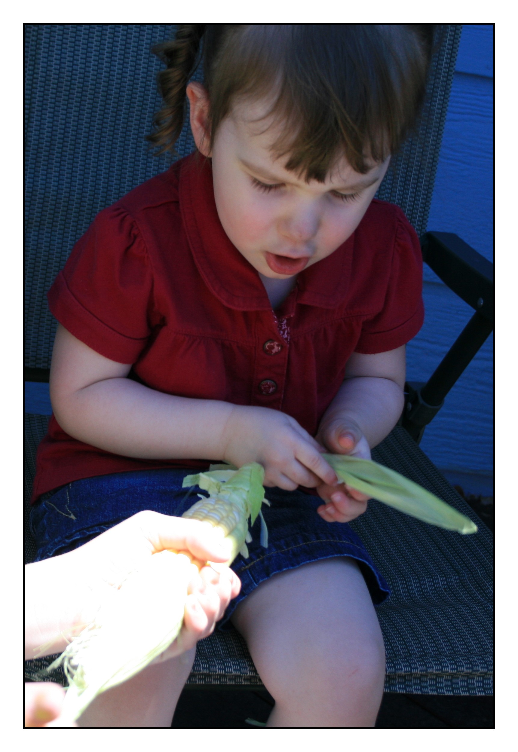 Audrey shucked corn for the first time today. According to my dad, who was helping her as I ran for the camera, the first time she