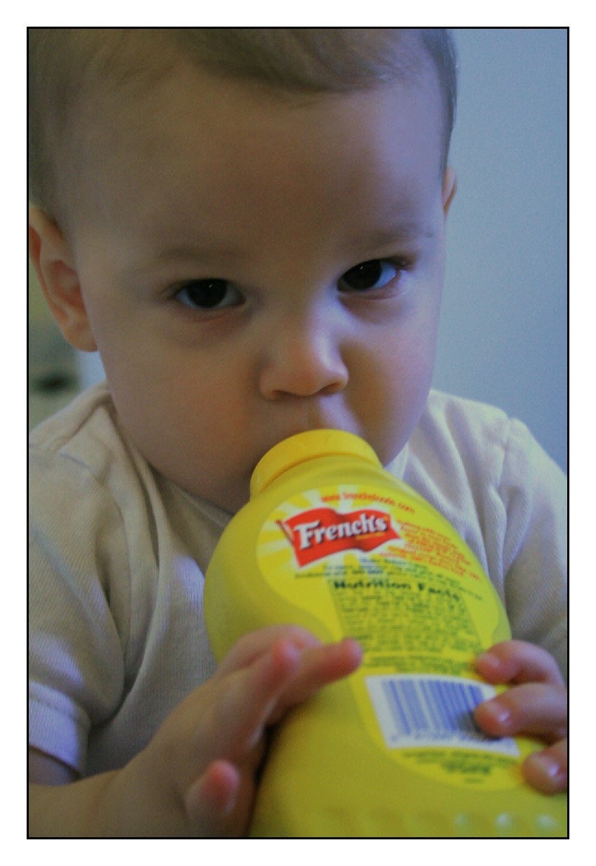 Chester found the mustard bottle today and put it in his mouth trying to drink out of it like a bottle or sippy cup. It was funny. You